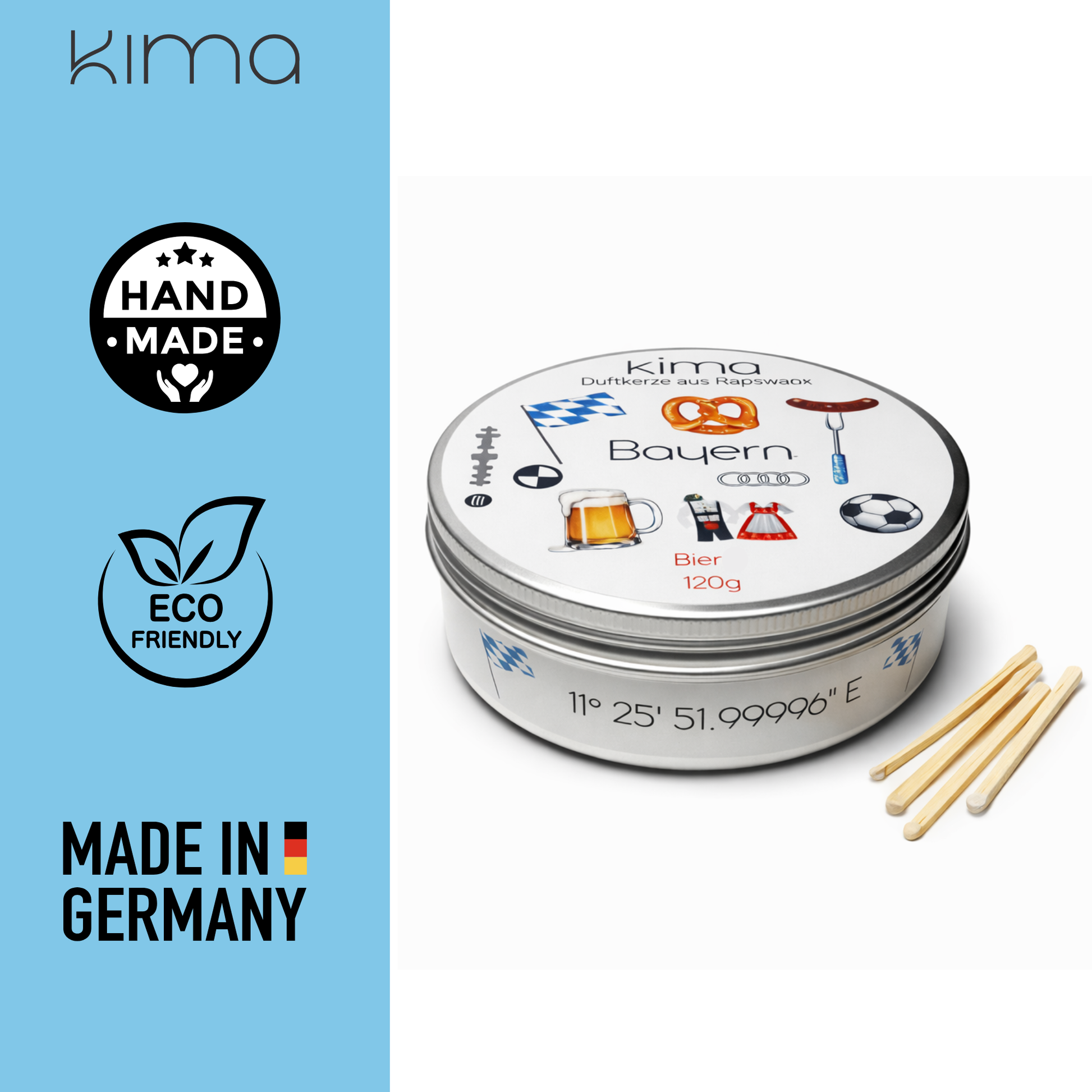 Die Duftkerze „Bayern“ kombiniert bayerische Gemütlichkeit mit einem überraschenden Bierduft – malzig, warm und leicht süß.