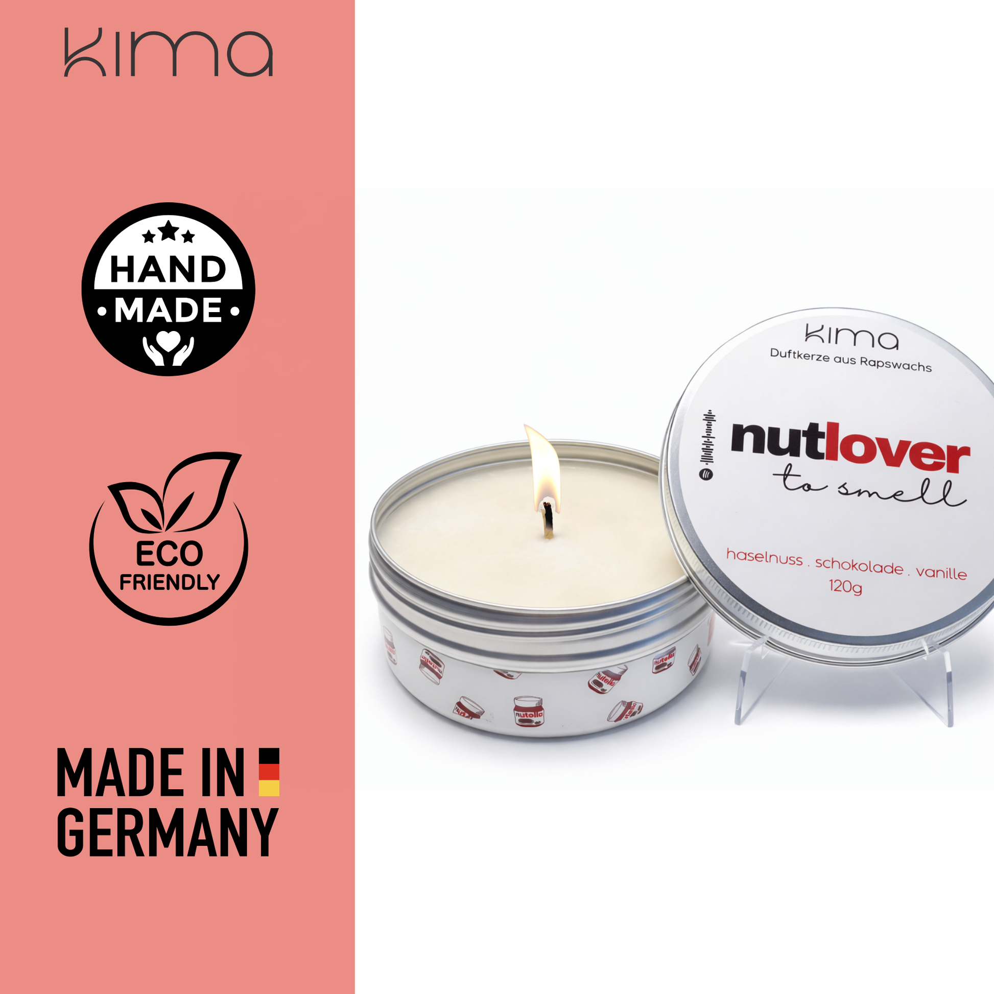 Der Duft vereint die intensive Nussigkeit von Haselnuss mit cremiger Schokolade und weicher Vanille. Eine Kerze, die sofort tröstet, entspannt und ein wohliges Gefühl von Zuhause schafft.